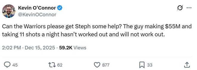 问题三:第二得分点 巴特勒是不错的攻防一体球星,但在球队陷入困境,库里独木难支时,巴特勒无法长时间提供球队需要的稳定数据产量。 本场巴特勒11投3中,仅拿到16分7篮板4助攻3抢断,这也是他本赛季的缩影,巴特勒场均仅出手11.4次,严重缺乏进攻威胁,无法提供勇士队需要的得分产量。 美记Kevin O'Connor直言勇士队需要为库里寻找帮手,让那些拿着5500万薪水的球员场均出手11次显然行不通,未来也难有转机。