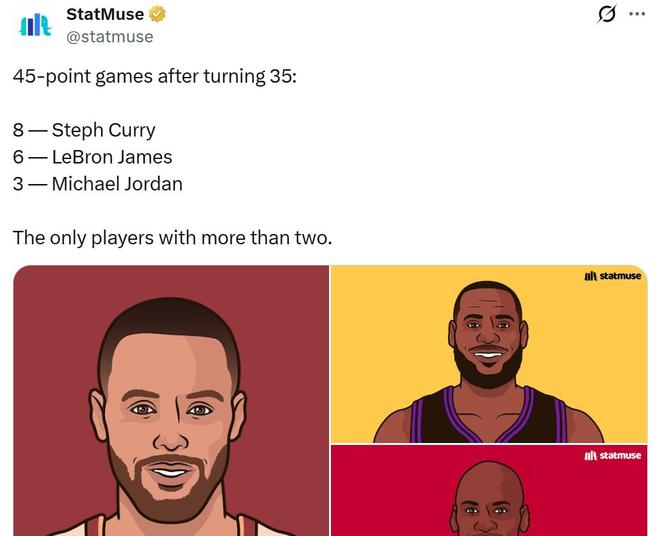 第六项:库里第28次做到单场至少命中10记三分NBA历史第一,克莱9次排名第二; 第七项:35岁后第8次单场拿到45+得分历史第一,詹姆斯6次排在第二,乔丹3次位列第三; 第八项:本赛季第3次轰下45+得分表现联盟最多; 第九项:场均命中5.2记三分联盟第一,有望生涯第4次做到单赛季场均命中至少5记三分,目前已经断档历史第一,除了库里之外没人做到过。