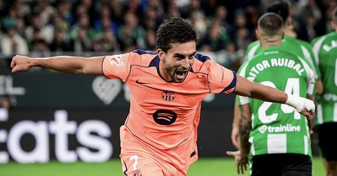 本场比赛,巴萨对阵容进行了轮换,也为下周的欧冠做准备,首发名单包括:13-霍安·加西亚、3-巴尔德、5-库巴西、18-赫拉德·马丁、23-孔德、24-埃里克·加西亚、8-佩德里、7-费兰、10-亚马尔、14-拉什福德、28-巴德吉,莱万、拉菲尼亚、德容等主力坐在替补席。 面对贝蒂斯,巴萨在上半场早早丢球,但很快进攻端火力全开,短短34分钟打进四球,更有球员上演了帽子戏法。 第6分钟,福纳尔斯射门被挡了一下,安东尼转身抽射破门,帮助贝蒂斯1-0取得梦幻开局。很快,费兰挺身而出,接到孔德的传球后完成包抄破门,帮助巴萨1-1快速扳平比分。