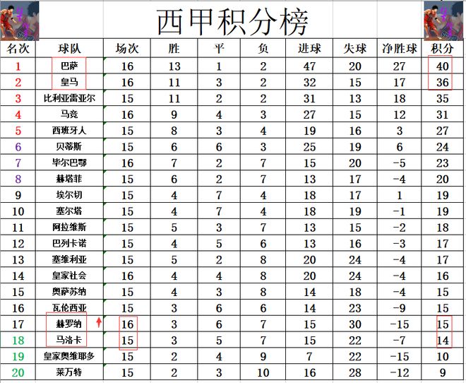 西甲最新积分战报赫罗纳逆转绝杀逃出降级区皇马落后巴萨4分